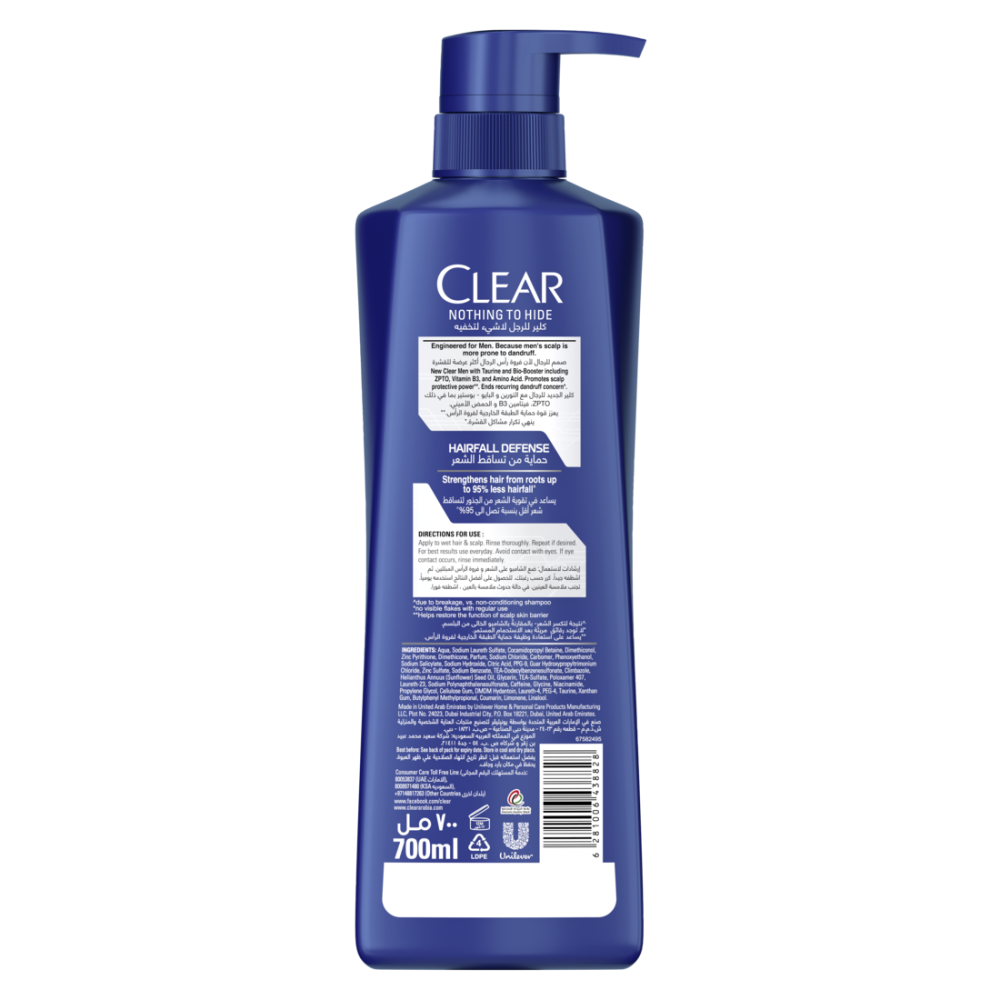 هل تواجه مشاكل تساقط الشعر مؤخرًا؟ تساقط الشعر هو إحدى مشاكل الشعر الشائعة. هناك العديد من العوامل التي تسبب مشاكل تساقط الشعر. أحد الأسباب الرئيسية قد يكون نتيجة تكسر الشعر وضعف جذور الشعر. شامبو كلير للرجال ضد القشرة "هير فول ديفينس"، المصمم خصيصًا للرجال، غني بخلاصة القهوة لإزالة جميع آثار القشرة والبقايا من فروة رأسك، بينما يغذي وينعش فروة الرأس. مع شامبو كلير ضد القشرة، أنت الآن مستعد للانطلاق. قل وداعًا لفروة الرأس المعرضة للقشرة والحكة. يتميز هذا الشامبو والبلسم 2 في 1 بتركيبة جل سائلة مع تقنية "3 زيرو تك" لتعزيز قوة حماية فروة الرأس وإنهاء مشكلة القشرة المتكررة تسعى كلير لتمكين الرجال والنساء من التميز عن الآخرين وإظهار وجهة نظرهم الفريدة للعالم. نحن نعلم أن هذا ممكن فقط عندما تكون لديك ثقة كاملة بفرديتك. ولهذا السبب، تم تصميم تركيباتنا لتمنحك علاجًا لا يضاهى للقشرة، لذلك لديك ضمان خلو فروة الرأس من القشرة والمشاكل. تقدم كلير مجموعة كاملة من منتجات العناية بالشعر الفعالة المصممة لعلاج كل نوع وملمس شعر. الآن، يمكن أن تكون كل لحظة هي لحظة تألقك، لأن ليس لديك "شيء تخفيه". يساعد على استعادة وظيفة حاجز جلد فروة الرأس. لا توجد قشور مرئية مع الاستخدام المنتظم.
