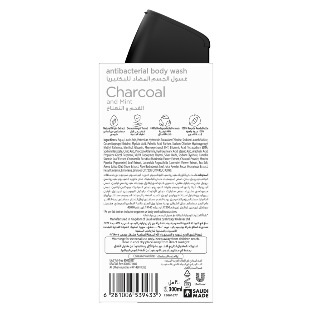 يقدم لك لايفبوي غسول الجسم بالفحم والنعناع - غسول جسم مضاد للبكتيريا للحماية من الجراثيم. 1 ستتغلغل الرغوة الغنية لهذا الشاور جل بعمق في مسامك، وتزيل الجراثيم، وتترك بشرتك محمية ونظيفة ومنتعشة. يوفر غسول الجسم حماية أقوى بنسبة 100% من الجراثيم، ويحمي من الفيروسات والجراثيم الأخرى*. 2 بتقنية أكتيف سيلفر+ التي توفر فوائد مضادة للبكتيريا لنظافة جيدة. 3 الشاور جل فعال مثبت ضد فيروس كورونا كوفيد-19*. 4 اختر حماية لايفبوي الموثوقة والمتقدمة من الجراثيم للحفاظ على حماية عائلتك بنظافة جيدة. *وفقًا لاختبار معملي على الكائنات الحية الدقيقة المؤشرة *غسل اليدين بالماء والصابون أو استخدام معقم اليدين الكحولي هو أحد الإجراءات الموصى بها للمساعدة في تقليل خطر انتشار الجراثيم. يرجى اتباع الإرشادات الإضافية الموصى بها من قبل السلطات الصحية. للحصول على أفضل تجربة، بلل ليفة واسكب 2-3 قطرات من غسول الجسم على الليفة. اضغط على الليفة لإنشاء رغوة، وضعها على كامل الجسم واشطفها جيدًا. سهل الاستخدام! الآن يمكنك التأكد من أن طفلك قد غسل كل الأوساخ والجراثيم أثناء الاستحمام بمفرده. جرب مجموعتنا الكاملة من غسول الجسم - لايفبوي توتال 10، العناية اللطيفة، الليمون المنعش، النعناع المنعش، ماتشا الشاي الأخضر والصبار، العسل والكركم، المعادن البحرية، الفحم والنعناع.